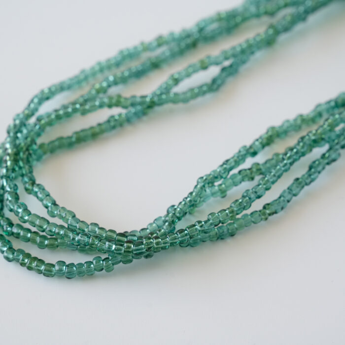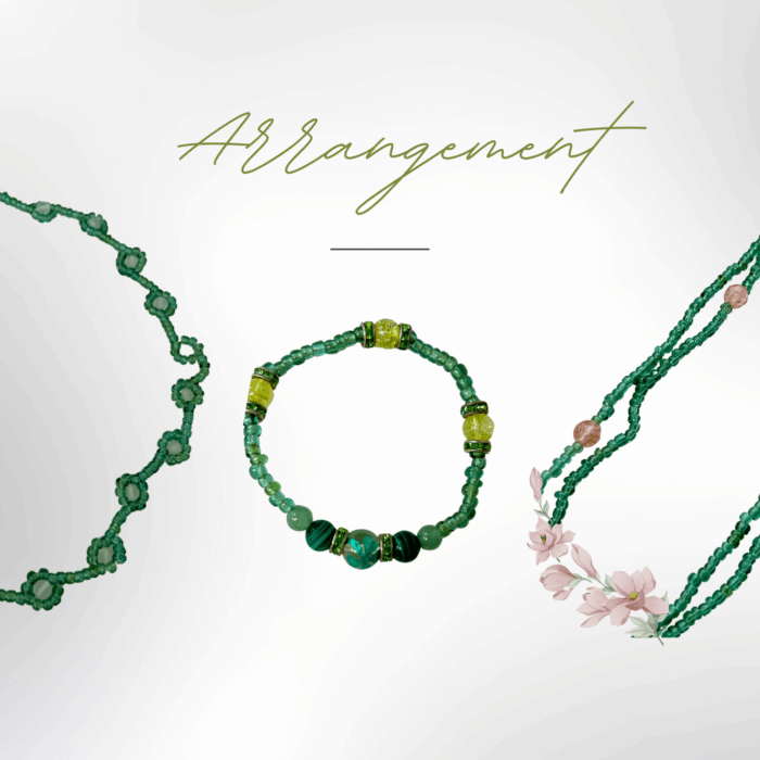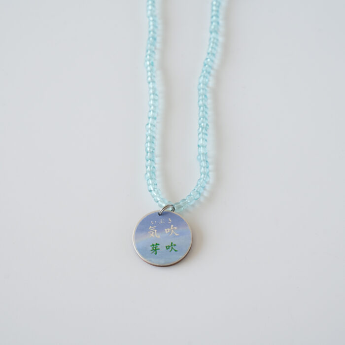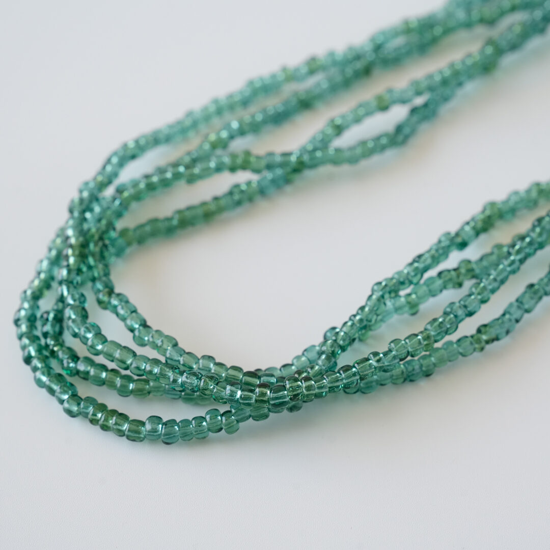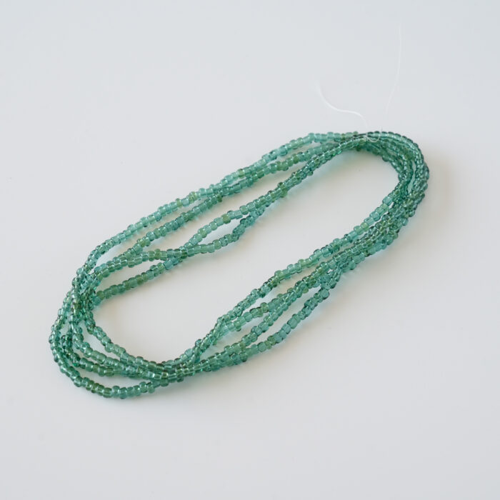 色は自然鉱石由来のもので、着色はしていません。化学物質などの不純物を一切使わず、エメラルド、ルビー、サファイア、トルマリン、麦飯石、水晶、翡翠など厳選した自然鉱石のみを原料に、すべて手作りで加工しました。若干伸びる紐になっています。