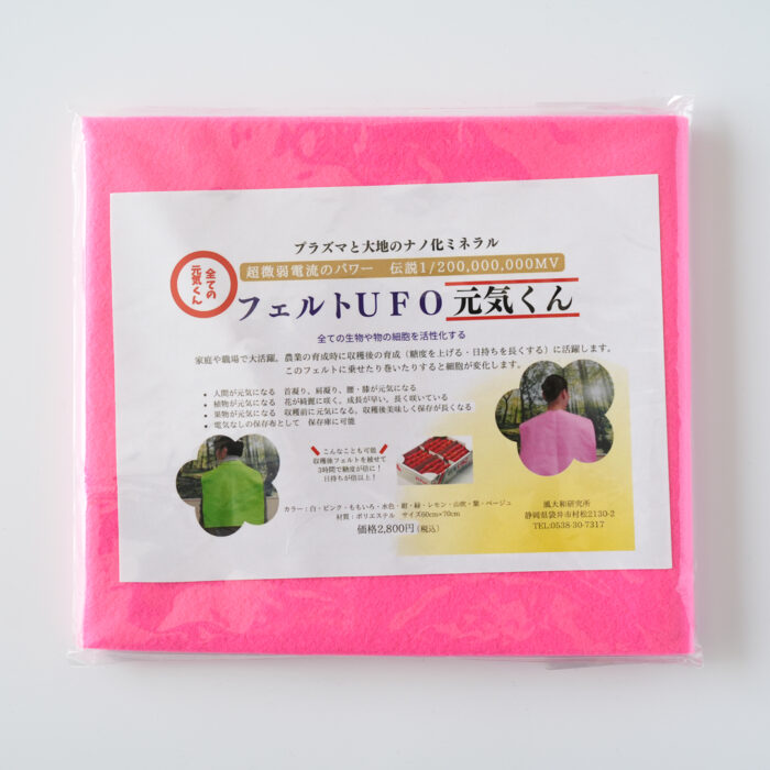 エレン鉱石を風大和研究所の装置(プラズマコイル、ぐるぐる)によってプラズマエレン化し、さらにそれを用いて「ナノ化エレン水」を作り、再度、ぐるぐるにかけて出来た「エレンナノ化水溶液」。そこにフエルトを漬けたり、噴霧、乾燥を経て、最終的にプラズマコイルに8時間注入、ピカソという装置にも8時間注入、ぐるぐるにも注入させて完成させたものがフエルトUFOです。なんとも氣の遠くなるような工程を経て、生まれました。